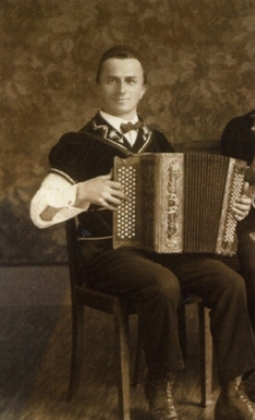 Hermann und Josef Scheidegger auf Familienfoto (mit Musikinstrumenten), 2. Reihe rechts, Fritz Scheidegger
